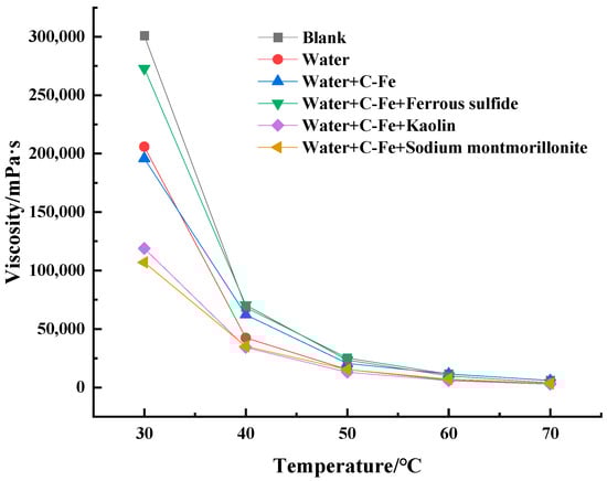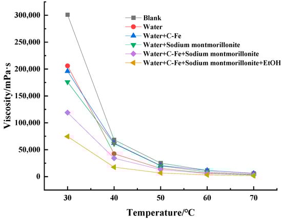 Figure 10 indicates that in the synergistic catalysis of minerals and C-Fe, the synergistic viscosity reduction effect of C-Fe and sodium montmorillonite was the best. The viscosity was reduced by 60.47% at 30 °C in comparison with the blank oil sample. Compared with the viscosity after aquathermolysis, the viscosity decreased by 42.23%. Therefore, the reaction system of sodium montmorillonite and C-Fe was selected for the subsequent experiment.