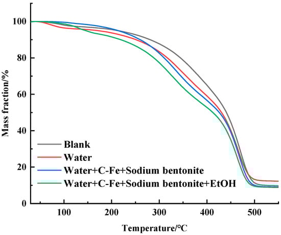 Figure 12 shows the TGA curves, while Table 4 presents the corresponding mass loss of the heavy oil before and after the reaction. After aquathermolysis catalyzed by sodium clay and a catalyst, it was observed that the weight loss rate of the oil with a boiling point less than 150 °C and more than 450 °C decreased, while the weight loss rate of the oil with a boiling point between 350 and 450 °C increased. The weight loss rate of light oil with a boiling point less than 150 °C increased after the aquathermolysis was catalyzed by sodium montmorillonite, catalyst, and an ethanol promoter. In addition, at a temperature above 350 °C, a significant reduction in mass loss was observed [31,32], which confirms that the addition of a composite catalyst promotes the conversion of asphaltenes, resins, and other heavy components to light components during the reaction process, leading to the increase in the light component content of oil samples, and then the viscosity of oil samples decreases.