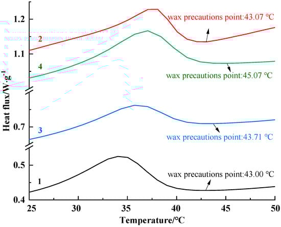 The DSC curves of the heavy oil before and after aquathermolysis. (1—blank; 2—water; 3—water + C-Fe + sodium montmorillonite; 4—water + C-Fe + sodium montmorillonite + ethanol).
