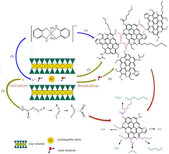 Due to the layered structure of clay, there are numerous cations in its octahedral voids and numerous broken bonds on the surface of clay minerals, which have strong adsorption effects on organic macromolecules. The synergistic dual catalytic mechanism of exogenous catalysts and clay minerals is shown in Figure 14 and Figure 15, which can be mainly described in the following stages: (1) The exogenous catalyst acts on the heteroatoms in the heavy components, destroying the hydrogen bonds between the molecules of some high-carbon hydrocarbon compounds, which results in the rupture of C-S, C=O, C-N bonds, etc. (2) The transition metal in the exogenous catalyst is easily exchanged with the sodium ion in the sodium montmorillonite, thus becoming the active center in the reaction. The presence of abundant vacant orbitals enables transition metals to readily engage with the electron-rich species present in heavy oil, thereby significantly enhancing the catalytic efficiency of the aquathermolysis decomposition in heavy oil [33,34]. (3) Due to the existence of Lewis acid on the surface of montmorillonite, high-carbon hydrocarbon compounds provide it with an electron, and simultaneously generate free radicals. The free radicals rearrange to promote the cleavage of C-C bonds and the formation of short-chain alkanes [35]. Clay minerals act as Bronsted acids to provide protons (H+) for the organic matter adsorbed by it. Protons (H+) are generated through the dissociation of the adsorbed water and interlayer water molecules that are bound to exchangeable cations. The primary reaction pathway for these protons involves the formation of transition-state carbocations [36,37]. (4) Upon the adsorption of water molecules onto the surface of clay minerals, the Lewis acid exhibits a high electron affinity, facilitating the sharing of an electron pair with the hydroxyl group in water. Consequently, the hydroxyl group becomes firmly adsorbed onto the surface of the Lewis acid, while the remaining H+ is readily released. This converts the Lewis acid into a Bronsted acid. When clay minerals are dehydrated, Bronsted acid sites are gradually converted into Lewis acids due to the lack of protons [38]. In this reaction system, montmorillonite activates the reactant water/steam, reduces the reaction activation energy, accelerates the breaking speed of some hydrogen bonds between the molecules of high-carbon hydrocarbon compounds, and improves the effectiveness of reducing the viscosity of heavy oil.