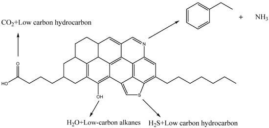 The viscosity of heavy oils was measured in accordance with ASTM D97-96. The viscosity reduction rate, denoted as Δη%, was determined using the formula ((η0 − η)/η0) × 100, where η0 and η (mPa∙s) represent the viscosities of the oil prior to and subsequent to the reaction [27,28]. Furthermore, the analysis of heavy oil components was carried out in accordance with the China Petroleum Industry Standard SY/T 5119-2016. An elementar vario EL cube was used to determine the elemental compositions (C, H, N, and S) of the original oil and the improved oil. The distribution of carbon in crude oil at various temperatures was assessed via thermogravimetric analysis. Under a nitrogenous environment, the oil samples were heated at a rate of 10 °C/min from 30 °C to 550 °C. According to SY/T 0545−2012, the wax precipitation point of the heavy oil was tested. Using Mettler−Toledo DSC822e DSC (Mettler Toledo Limited, Shanghai, China) equipment, the different scanning calorimetry (DSC) analyses of heavy oil were all performed within a temperature range of −25 to 50 °C, a flow rate of 50 mL/min, and a nitrogen environment.