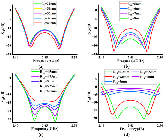 (a) The effect of Li on S11; (b) the effect of Lin on S11; (c) the effect of RLo on S11; (d) the effect of RLi on S11.