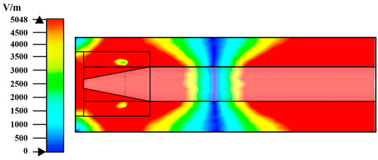 It can be observed from Figure 5 that S11 is less than −13 dB, indicating a near 100% energy utilization efficiency. Additionally, it can be seen from Figure 6 that the majority of the bulb region is subjected to a uniform electric field, exceeding the breakdown electric field of the filling gas. This means that it is possible to ionize the inert gas and emit ultraviolet rays.
