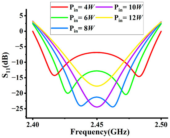 As the input power increases, S11 at 2.45 GHz shows a trend of becoming smaller in the range of 4~10 W, and then S11 at 12 W becomes larger. From the theoretical analysis, in the range of 4~10 W, as the input power increases, the electrons gain more energy from the electric field, and the chance of collision with other particles increases greatly, resulting in more excitation ionization, so the S11 will become smaller. When the power continues to increase, the excess input energy is wasted instead, so the energy utilization rate decreases and the S11 increases.