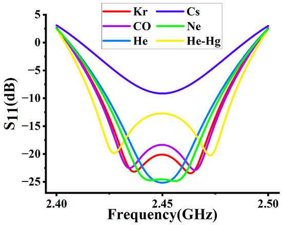 From Figure 11, it is found that under the same conditions, S11 is larger than −10 dB when Cs gas is filled, and smaller than −10 dB when other gases are filled. The gas types with S11 from large to small are Ar-Hg, CO, Kr, Ne, and He.