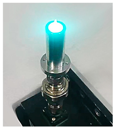 The lamp was successfully lit by high-frequency microwaves, as shown in Figure 14. Additionally, dental curing lamps typically feature a light outlet diameter ranging from 8 to 10 mm. This miniaturized lamp has an outlet diameter of 9 mm, which meets the size requirements for dental curing lamps.