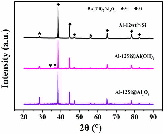 Microencapsulation of the alloy PCM was achieved with steam-assisted oxidation treatment [31,32]. Figure 2 shows the XRD spectra of the pristine Al-12wt%Si alloy and the microcapsule samples before and after calcination; it can be found that for the two encapsulated samples, in addition to all the absorption peaks in the pure alloy, two additional sharp diffraction peaks of Al2O3/Al(OH)3 are also clearly observed [27,33]. The Al(OH)3 that appears after steam treatment can be transformed into the corresponding Al2O3 after calcination. Due to the low Si content and the presence of Al2O3 film on the surface, the Al diffraction peaks are sharp, and the intensity of the Si absorption peaks is very low. The diffraction peak intensities of Al and Si are slightly increased after sintering treatment, which may be due to a small amount of leakage of molten Al-Si alloy at the weak position of the composite. Moreover, the leaking alloy can be rapidly oxidized to an extra silica-containing Al2O3 shell in a high-temperature oxygen-containing environment, spontaneously completing the defect repair.