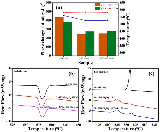 Thermal property images for pure alloy, Al-12Si@Al2O3, and Al-12Si@Al2O3 after 30 cycles: (a) The total performance image, (b) The specific endothermic curves image, (c) The specific exothermic curves image.