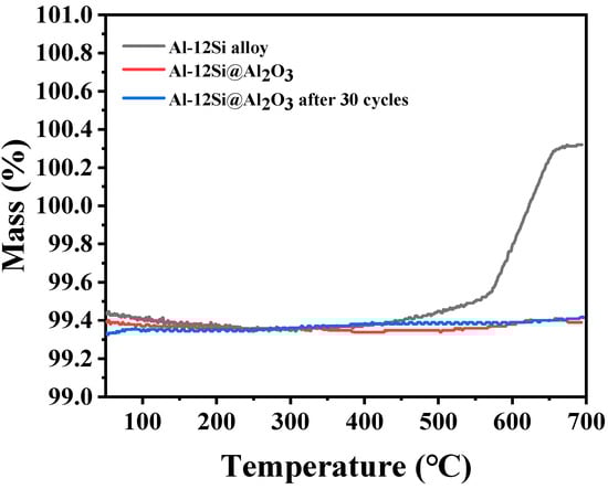 The TG curves for pure alloy, Al-12Si@Al2O3, and Al-12Si@Al2O3 after 30 cycles.