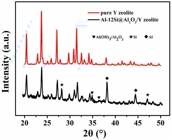 Figure 7 displays the XRD patterns for the pure Y zeolite and Al-12Si@Al2O3/Y zeolite, and the phase structure of the Y zeolite is completely consistent with that reported in the literature [34,35]. This may be due to the larger mass ratio and stronger diffraction intensity of the catalytic component, resulting in the composite sample showing only the diffraction peaks of the Y zeolite. However, by carefully comparing the XRD results of the two samples, it is not difficult to find that the diffraction peaks belonging to the PCM microcapsule should just be covered rather than absent, because the relative intensity of the peaks at the positions of these peaks is obviously higher than that of the pure Y zeolite, demonstrating that the PCM component has good thermal stability and successfully completes assembly with the catalytic component.