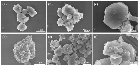 SEM images of the Al-12Si@Al2O3/Y zeolite and its blank sample: (a–c) composite FCC blank sample, (d–f) Al-12Si@Al2O3/Y zeolite.