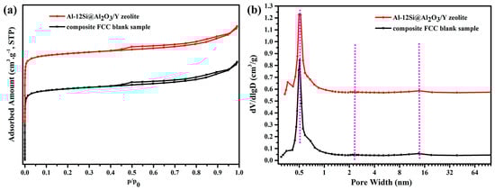 N2 adsorption–desorption isotherms (a) and pore size distributions (b) for Al-12Si@Al2O3/Y zeolite and its blank sample.