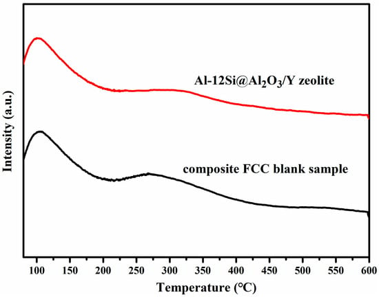 The N2 adsorption–desorption isotherms and pore size distributions of the Al-12Si@Al2O3/Y zeolite and its blank sample are shown in Figure 9, and the detailed texture performance parameters are listed in Table 2. In Figure 9a, both samples display a typical type-IV adsorption isotherm equipped with a type-H3 hysteresis loop according to the IUPAC classification [36,37]. This indicates the presence of a mesoporous structure, especially the slit pores generated by the accumulation of microcapsule components and Y zeolite components. The pore size distribution image (Figure 9b) intuitively confirms that the two materials have similar hierarchical pore structures. In addition to micropores of less than 2 nm, mesopores are mainly distributed in the ranges of 2–4 nm and 8–32 nm. Comparing the data in Table 2, the values of SBET, SMic, VMic, VT, and VMes for both samples are virtually identical. Further verifying the acidity features of the target sample and the composite FCC blank sample, NH3-TPD tests were performed to determine the strength and number of acidic sites. In general, the desorption peaks located at the low-temperature zone (100–250 °C), medium-temperature zone (250–400 °C), and high-temperature zone (400–600 °C) are ascribable to weak acid sites, medium acid sites, and strong acid sites, respectively [38,39]. It can be seen in Figure 10 that all the curves possess only two desorption peaks: a strong peak in the low-temperature zone and a relatively weak peak in the medium-temperature zone, showing the absence of strong acid sites and that the majority of acidity in all samples is mainly induced by weak acid sites. The concentrations of acid sites with different strengths were further quantified with the NH3-TPD curves of the two samples (Table 3). It can be seen that the Al-12Si@Al2O3/Y zeolite and the composite blank sample remain essentially the same in terms of the number of each type of acid site, just like the texture performance parameters. These results explain the rationality of the blank sample setting.