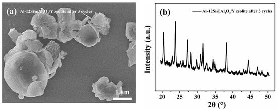 The SEM patten (a) and XRD curve (b) for reused Al-12Si@Al2O3/Y zeolite after three cycles.