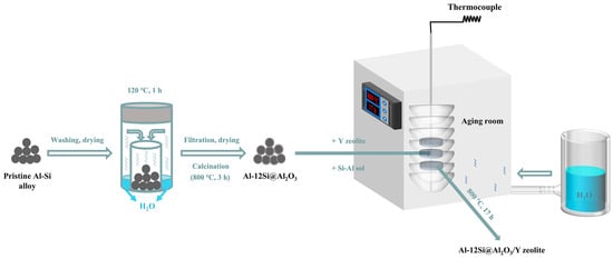 The raw materials used in this work include Al-12wt%Si alloy microspheres (5–8 um, Hunan Ningxiang Jiweixin Metal Powder Co., Ltd., Changsha, China), spherical alumina (Al2O3, Henan Tianma New Material Co., Ltd., Zhengzhou, China), silica–alumina sol (Shaoxing Shangyu Yinyu Silicon Products Co., Ltd., Shaoxing, China), Y zeolite (Laboratory self-made), and ethanol (99%, Beijing Tong Guang Fine Chemicals Company, Beijing, China). All used reagents were without further purification.