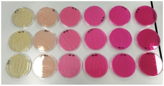 Before the biodegradation tests of RhB by S. cerevisiae, the growth of the yeast was carried out in a solid Sabouraud medium (15 g L−1 agar), to which RhB was added before sterilization. After 48 h of incubation at 25 °C, at all RhB concentrations, S. cerevisiae was able to grow (Figure 3). So, RhB did not prevent the yeast from growing, meaning it can be used in biodegradation tests.