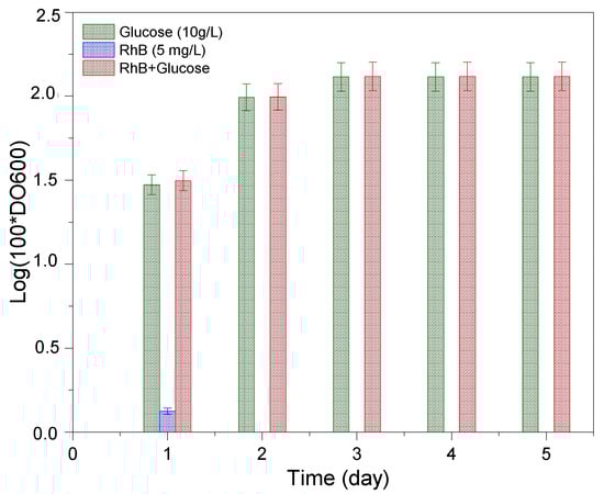 The mineral medium (described in Section 2.3) to which either RhB (5 mg L−1), glucose (10 g L−1), or RhB and glucose were added before sterilization was inoculated as described before (described in Section 2.4). The culture was incubated at 28 °C, 130 rpm agitation for 5 days, during which time cell growth and the RhB concentration were monitored. Each experiment was carried out in triplicate.