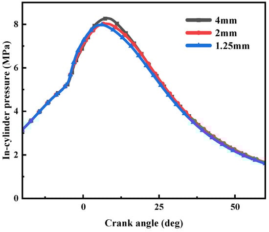 The size of the mesh affects the computational accuracy and computational speed of the model. A grid that is too small will lead to slow computation. Conversely, a grid that is too large will lead to a computational accuracy that cannot be guaranteed. In order to exclude the influence of the grid size, the independence of the grid was verified by comparing the simulated in-cylinder pressure of three basic grid sizes. In this paper, three grid sizes, coarse (4 mm), medium (2 mm), and fine (1.25 mm) were chosen. Among them, the number of grids for fine, medium, and coarse grids was 107,692, 434,431, and 932,555, respectively. As can be seen from Figure 3, the difference between the in-cylinder pressure of the fine and medium grids was small, but the data of the coarse grid differed greatly from the fine and medium grids. In order to ensure the accuracy and calculation speed at the same time, the medium grid was chosen in this paper. The subsequent meshes for the numerical study were all used with the 2 mm grid.