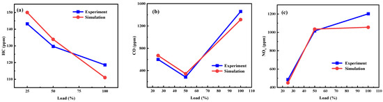 Comparison of experimental and simulated HC, CO, and NOx emissions at different loads. (a) HC emission; (b) CO emission; (c) NOx emission.