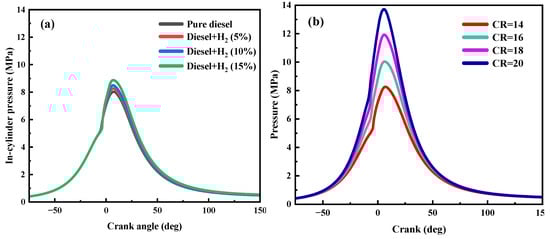 Effect of HES (CR = 14) and CR (HES = 5%) on in-cylinder pressure. (a) Effect of HES (CR = 14); (b) Effect of CR (HES = 5%).