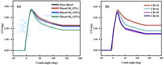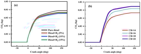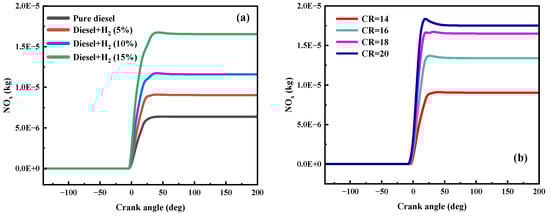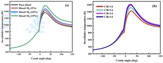 As shown in Figure 9a, compared to pure diesel operation, the temperature in the cylinder increased from 1370 K to 1580 K with the HES of 15%. At all operating conditions, the peak in-cylinder temperature occurred at 0–10 deg. As hydrogen was added, the cylinder temperature rose. However, during combustion, the relationship between the amount of hydrogen added and the in-cylinder temperature was reversed. In the early stage, the bigger the HES, the lower the cylinder temperature became. However, at the crank angle of −3.09 deg, the addition of hydrogen still increased the cylinder temperature. However, the more hydrogen added, the higher the cylinder temperature. This is due to the fact that a large amount of hydrogen has been ignited and it burns very fast, so the temperature in the cylinder rises dramatically.