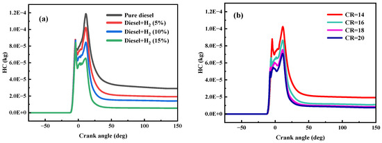 Effect of HES (CR = 14) and CR (HES = 5%) on HRR. (a) Effect of HES (CR = 14); (b) Effect of CR (HES = 5%).