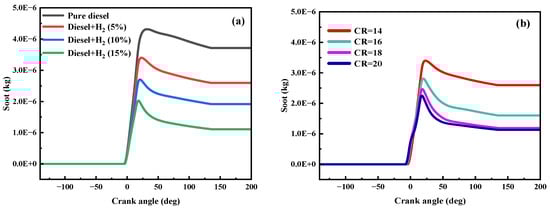 Effect of HES (CR = 14) and CR (HES = 5%) on soot emission. (a) Effect of HES (CR = 14); (b) Effect of CR (HES = 5%).