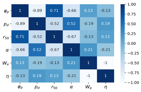 The correlation heat map of each feature parameter after dimensionality reduction is shown in Figure 1, which shows that the structural seepage coefficient is negatively correlated with the drainage pressure, the median radius is positively correlated with the structural seepage coefficient, the pore–throat ratio is almost linearly independent of the structural seepage coefficient, mercury removal efficiency and drainage pressure.