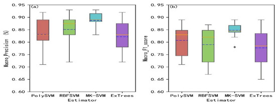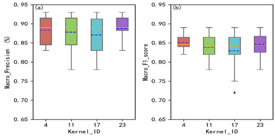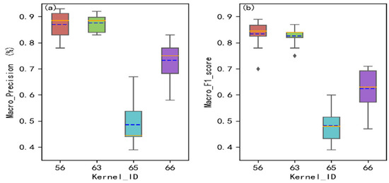 In Figure 2, the abscissa represents the corresponding ID number of the kernel function combination under different hyperparameters. The ordinate in Figure 2a corresponds to the index Macro_Precision, and Figure 2b corresponds to the Macro_F1_score. The orange solid line in the figure represents the median of the 10 experimental results, and the blue dotted line represents the mean of the 10 experimental results. The diamonds represent the outliers, and the position of the median can determine the distribution of the data in the 10 experimental results. The average level of the test results can be judged from the position of the mean value, while the convergence and stability of the model can be judged from the length of the box. The middle line of the box is the median of the data, which represents the average level of the sample data, while the upper and lower limits of the box are the upper and lower quartiles of the data, respectively. This means that the bin contains 50% of the data. Therefore, the width of the bins reflects, to a certain extent, the degree of fluctuation in the data.