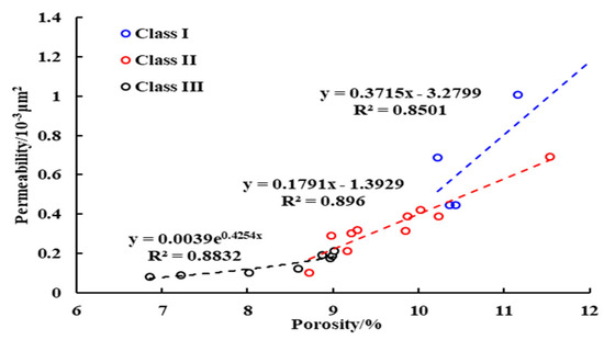 Nano pores account for the largest proportion in tight reservoirs and have a very important impact on the physical properties of reservoirs [21]. In order to further verify the accuracy of the comprehensive evaluation and prediction model (MK-SVM) of reservoirs, the relationship between porosity and permeability of class I, II, and III reservoirs was deeply analyzed. It can be seen from Figure 5 that there is an obvious positive correlation between the porosity and permeability of the I, II and III reservoirs, and the correlation coefficients R2 are all greater than 0.85, which shows that in the same type of reservoir, the microscopic development degree of pores has a strong control effect on the seepage capacity of the reservoir. It is further proved that the accuracy of the MK-SVM model is sufficient to provide reliable prediction results.