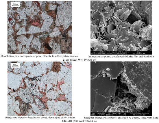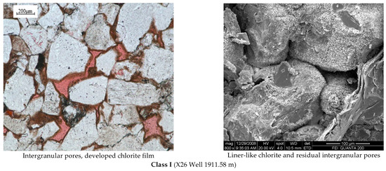 The samples in this work were collected from Chang 6 reservoir in Yanchang Formation in the Wuqi area, Ordos Basin. The porosity and permeability of the measured samples combined with previous studies show that the reservoir is a typical tight sandstone reservoir with low permeability and extra low permeability, the lithology is mainly feldspar sandstone, the clastic particles are well sorted, the roundness is sub-angular, and the cementation types are mostly pore-film, thin film, and enlarged-pore cementation. The main pore types are residual intergranular pores, feldspar soluble pores and lithic soluble pores [21]. The difference in reservoir space between different types of reservoirs is shown in Figure 6. According to Figure 6, the porosity development degree and connectivity of class I, II and III reservoirs become worse in turn.