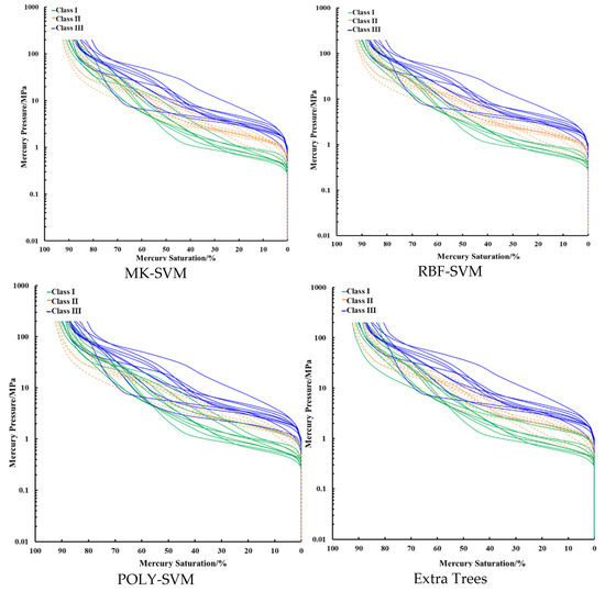 Based on the high-pressure mercury injection experimental data and dimensionality-reduction results of 25 rock samples in the study area, the reservoir can be classified into classes I, II and III by using four prediction types—Polynomial SVM, RBF SVM, MKL and Extra Trees. The capillary pressure (mercury injection) curve characteristics are shown in Figure 8. As can be seen from Figure 8, the boundary of capillary pressure curves of the three types of reservoirs obtained via the MK-SVM comprehensive evaluation and prediction model is the most obvious, and the reservoir classification results are very suitable for the classification and evaluation of the Chang 6 tight sandstone reservoir in the study area.
