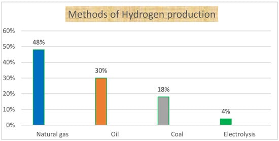 Historically, the majority of commercial hydrogen production has been derived from fossil fuels, primarily natural gas, oil, and coal, as shown in Figure 2. These processes are known as steam methane reforming (SMR), partial oxidation, and coal gasification, respectively. These methods are collectively referred to as “gray hydrogen” or “brown hydrogen”, because they release carbon dioxide (CO2) emissions during the production process [].