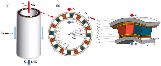 The fundamental component of a LNG gasifier is the gasifier tube, through which LNG is introduced from the bottom. The LNG undergoes gasification by utilizing heat from the surrounding seawater or air, which heats up the LNG within the tube. The authors [31] proposed an innovative gasifier tube integrated with a thermoelectric generator, as depicted in Figure 1a. This design combines a conventional gasifier tube with annular thermoelectric generators positioned on the outer side of the tube. Consequently, the system enables the recovery of cold energy for power generation during the LNG gasification process. The newly developed gasifier with a thermoelectric generator operates without any moving parts or working medium. It can generate power as long as there is a temperature difference, without impeding the regular functioning of the LNG gasification process. Moreover, it is not constrained by fluctuations in the gasification volume, offering favorable economic prospects and broader applicability.