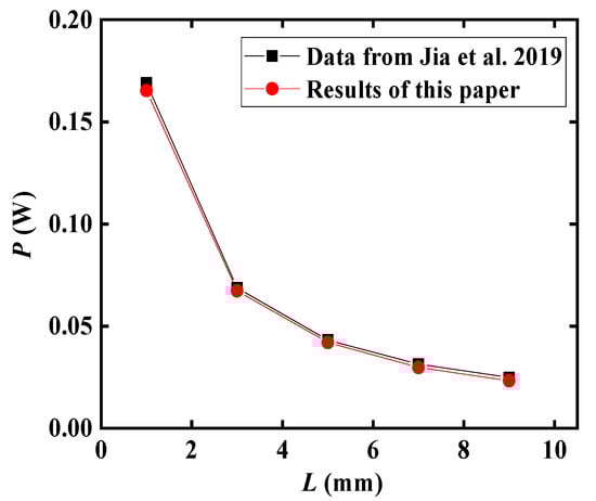 In order to validate the reliability of the proposed model, this study conducts a comparative analysis between the simulation results obtained and those reported in the literature [38], as depicted in Figure 4. The TEM structure examined in the literature [38] features a flat plate configuration with Bi2Te3 as thermoelectric material. The hot and cold side temperatures of the TEM are set to 300 K and 400 K, respectively. Under steady-state conditions, the influence of the TEM’s thermoelectric properties is investigated for a central angle of 11.25° and TEL heights ranging from 1 mm to 9 mm. The results obtained from the model calculations in this study exhibit a high level of agreement with the findings reported in the literature, with an error margin within 2%. This close correspondence between the simulation results and literature data provides strong evidence supporting the reliability of the proposed model.