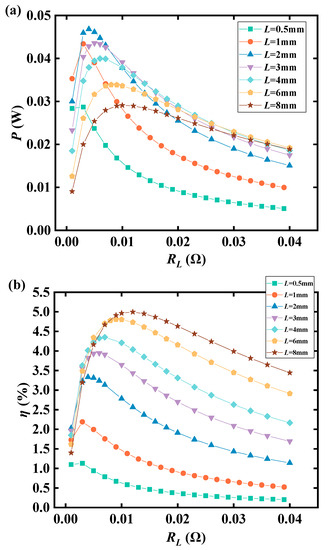 Variation of thermoelectric performance of TEM with load resistance for different TEL heights. (a) Output power. (b) Conversion efficiency.