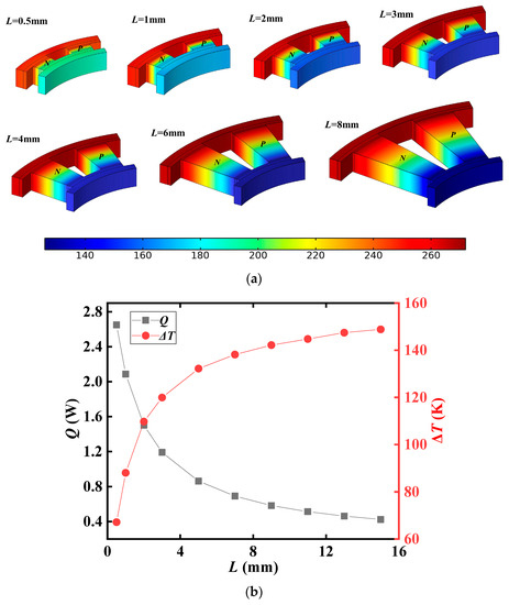 Variation of temperature parameters with central angle of TEL. (a) Temperature cloud diagram (L = 5 mm). (b) Temperature difference between hot and cold ends.