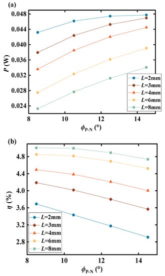 The influence of the central angle of the TEL on the thermoelectric performance of the TEM is further investigated, as illustrated in Figure 7. With an increase in the central angle of the TEL, the output power gradually rises while the efficiency gradually declines. Specifically, at a TEL height of 2 mm, when the TEL central angle increases from 8.5° to 14.5°, the output power of the TEM experiences a 10.9% increase, whereas the conversion efficiency decreases by 22.34%. Furthermore, the figure indicates that the impact of the central angle variation diminishes as the TEL height increases.