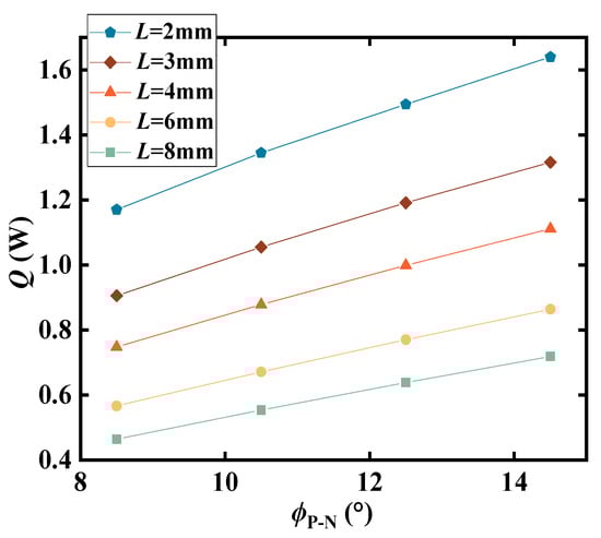 The variation in the heat exchange capacity of the TEM with respect to the central angle of the TEL is depicted in Figure 8. It can be observed that the heat exchange capacity increases gradually as the TEL central angle increases. An increase in the TEL central angle leads to a reduction in the thermal resistance of the TEM. Consequently, the heat exchange capacity of the TEM increases.