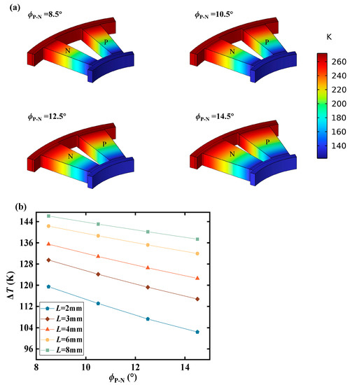 The temperature distribution within the TEM is influenced by the central angle of the TEL, as illustrated in Figure 9. However, it is observed that the variation in the central angle has minimal impact on the temperature distribution of the TEM. On the other hand, the TDHC decreases with an increase in the TEL central angle, which consequently leads to a decrease in conversion efficiency. Furthermore, it is noteworthy that when the TEL height is large, the change in the central angle of the TEL results in a relatively small variation in thermal resistance. Consequently, the heat exchange capacity and TDHC undergo less significant changes, thereby reducing the impact of central angle variation on the thermoelectric performance of the TEM.