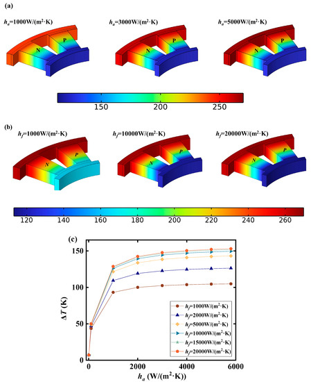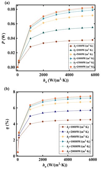 The temperature variations corresponding to different HTCs inside and outside the tube are presented in Figure 11. Increasing the HTC outside the tube ha effectively raises the temperature at the hot end of the TEL, thereby increasing the TDHC. Consequently, the HTC inside the tube hf is increased to lower the temperature at the cold end of the TEL and further enhance the TDHC. However, it should be noted that, in relative terms, a higher HTC is required at the cold end due to the larger surface area of the hot end of the TEM. Overall, it is evident that when the HTCs inside and outside the tube reach hf = 10,000 W/(m2·K) and ha = 4000 W/(m2·K), respectively, the conversion efficiency can reach 6.98%. Subsequent improvements in thermoelectric efficiency resulting from further escalation of the HTC are minimal. Additionally, it is important to consider that increased HTCs often necessitate additional energy consumption. Therefore, the design of thermoelectric generators for LNG cold energy recovery must consider the coupled effects of heat transfer, flow resistance, and thermoelectric conversion.