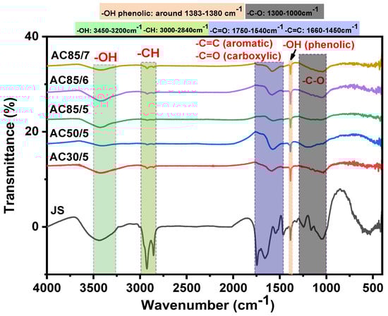 - El-Hendawy, A.-N.A. Variation in the FTIR spectra of a biomass under impregnation, carbonization and oxidation conditions. J. Anal. Appl. Pyrolysis 2006, 75, 159–166. [Google Scholar] [CrossRef]