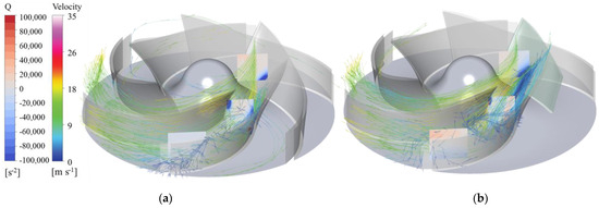 Compared with Figure 22a,b, under the working condition 0.6Qd, there were multiple vortices near SS in the flow line in this channel, but it is obvious that the flow line vortex area in BB channel was larger and more noticeable. The value of the Q criterion on the plane also reflects this problem. Compared with Figure 22c,d, under the working condition 1.0Qd, the streamline distribution in the channel in the NB condition was uniform, while there was a huge vortex near the inlet of the SS surface in the channel in the BB condition, which caused the fluid in the adjacent channel to be attracted into the channel. By comparing the values of the Q criteria of each plane, it can be concluded that there was only one region with an excessive strain rate near the wall under NB condition. However, under the BB condition, in addition to the larger area near the wall where the strain rate was too large, there was also a cross area where the strain rate in the channel was too large and the rotation intensity was too large. Compared with Figure 22e,f, the effect of broken blades on the flow state in the impeller at 1.4Qd was small, and the effect caused by the mismatching of the inlet and outlet angles of the blades occupied the dominant position.