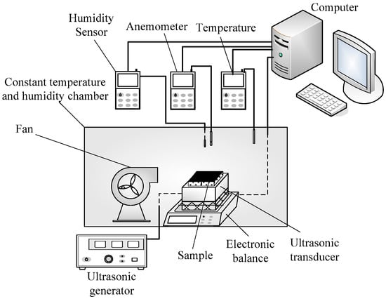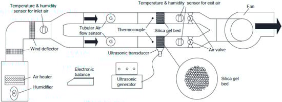 Santacatalina et al. [] established a drying kinetics model for apple enhanced by ultrasound, assuming that the process was determined solely by diffusion (D model) when external resistance was not considered, and was jointly determined by convection and diffusion (D+C model) when external resistance was considered. The fitting of experimental results to the theoretical model showed that considering external resistance was more appropriate. Jose et al. [] fitted the experimental results of the ultrasonic-assisted drying of fruits and vegetables to the theoretical model, showing that the D+C model had better fitting results, and the enhancement effect of ultrasound was mainly achieved through influencing external resistance. Ye Yao et al. [,] fitted the experimental results of the ultrasound-assisted silica gel desiccant regeneration process to different theoretical models, and the schematic diagram of the experimental system is shown in Figure 3. The results showed that Gaussian and Weibull’s proposed theoretical models were more suitable for this drying process. Subsequently, a theoretical model coupling acoustic field with heat and moisture transfer processes was established to simulate the dehydration regeneration process of ultrasonic-assisted silica gel desiccant, and the accuracy of this theoretical model was verified through experiments. Equations relevant to the heat and mass transfer of a silica gel-packed bed during the regeneration process can be summarized as below: