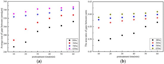 (a) The average pore size under different ultrasound pretreatment power and treatment time; (b) the porosity in the surface under different ultrasound pretreatment power and treatment time.