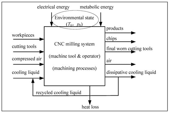 Since exergy analysis theory has the ability to quantify both material and energy flows in one metric, it is a suitable method for assessing the sustainability of machining systems. Gutowski et al. [] firstly proposed a thermodynamic framework to analyze the material and energy resources used in 20 manufacturing processes. The research showed that new manufacturing processes primarily generate an increase in material/energy intensity, rather than traditional technologies. Renaldi et al. [,,] provided different definitions of exergy efficiency for subtractive processes, additive processes, and mass-conserving processes. Salman Pervaiz and Mohamed Gadalla [,] established a physical model of exergy analysis for the metal dry-cutting process. In a dry-cutting experiment, they found that the exergy efficiency of removal is very different from the overall efficiency. Ghandehariun et al. [] established the calculating model of exergy loss for the dry turning process and optimized the exergy loss by solving the partial derivative of the model function. In another study, Ghandehariun et al. [] provided an exergy efficiency model of drilling processes and analyzed the variation tendency between exergy loss and feed rate by experimental tests. Benjie Li et al. [] pointed out that the energy used to maintain the thermal stability of a motorized spindle is useful energy consumption. Based on this, a new energy efficiency model was established under exergy analysis for a high-speed dry hobbing machine. The above research works indicate that exergy analysis is a good method for assessing the sustainability of the CNC milling system.