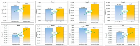 The energy consumption of the operator is 169,750 J during 922 s machining time in this case study, while the result is 36,739.2 J during 209.1 s machining time in the literature []. This means that the average power consumption of the operator is 184.1 W and 175.7 W in the machining system, respectively. It is significant to quantify the energy consumption of the operator with a modeling approach. In the literature [], the specific exergy consumption is calculated as 59.49 J/mm3 for an external cylindrical gear without considering the operator and the cooling liquid. The SEL model proposed in this study can provide a comprehensive assessment on the sustainability of different machining systems.