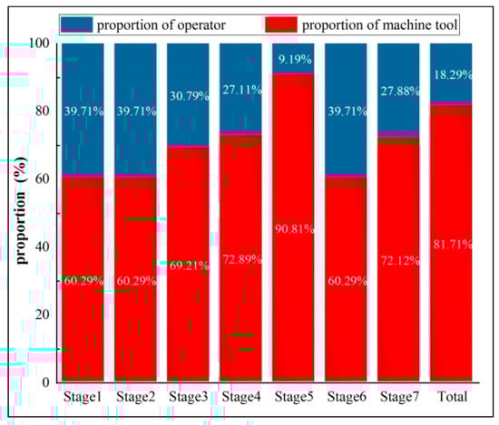 where ti (i = 1, 2, 3, 4, 6, 7) (s) is the duration of stage i, t5−1 (s) is the duration of sub-stage 1 (air-cutting activity), and t5−2 (s) is the duration of sub-stage 2 (material removal activity).