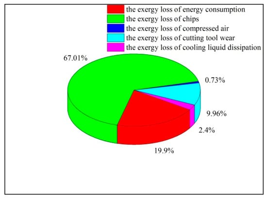where Exloss,energy (J), Exloss,chips (J), Exloss,air (J), Exloss,tool (J), and Exloss,cooling (J) represent the exergy loss of energy consumption, the exergy loss of chips, the exergy loss of compressed air, the exergy loss of cutting tool wear, and the exergy loss of cooling liquid dissipation, respectively.