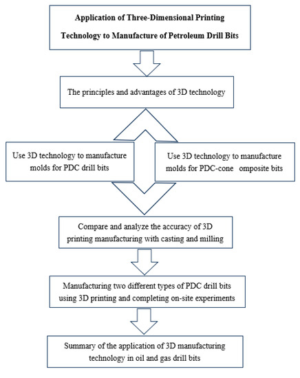 The research idea of the manuscript is to first introduce the principles and advantages of 3D technology, then use 3D technology to manufacture molds for PDC drill bits and PDC composite drill bits, relying on 3D coordinate instruments to detect the machining accuracy of 3D-printed molds, pressure molds, and milling molds by using traditional processes. Finally, two different types of PDC bit products were manufactured using 3D printing technology, and field experiments were completed, which verified the feasibility of 3D manufacturing technology in oil bit manufacturing and provided ideas and data support for the future application of 3D printing technology for conical PDC composite bits. The research roadmap for the manuscript is shown in Figure 1.